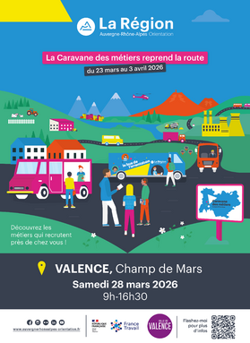Créé par Auvergne-Rhône-Alpes Orientation et ses partenaires, la Caravane des métiers est un évènement itinérant qui permet à tous les habitants de la région de découvrir les métiers et plusieurs secteurs professionnels de façon ludique. Composée d’une quinzaine de véhicules, engins de démonstration et stands, elle sillonnera 11 départements du territoire du 23 mars au 3 avril 2026.